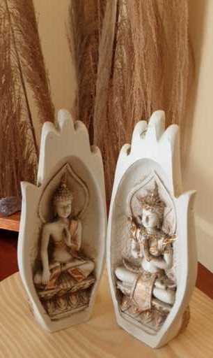 PAR DE MÃOS BUDISMO (21CM) - MARFIM As mãos podem ser usadas fechadas ou abertas, as quais possuem a imagem de Sidarta (Buda) e da Deusa Tara (Deusa da Cura) no interior, com detalhes em dourado rosé